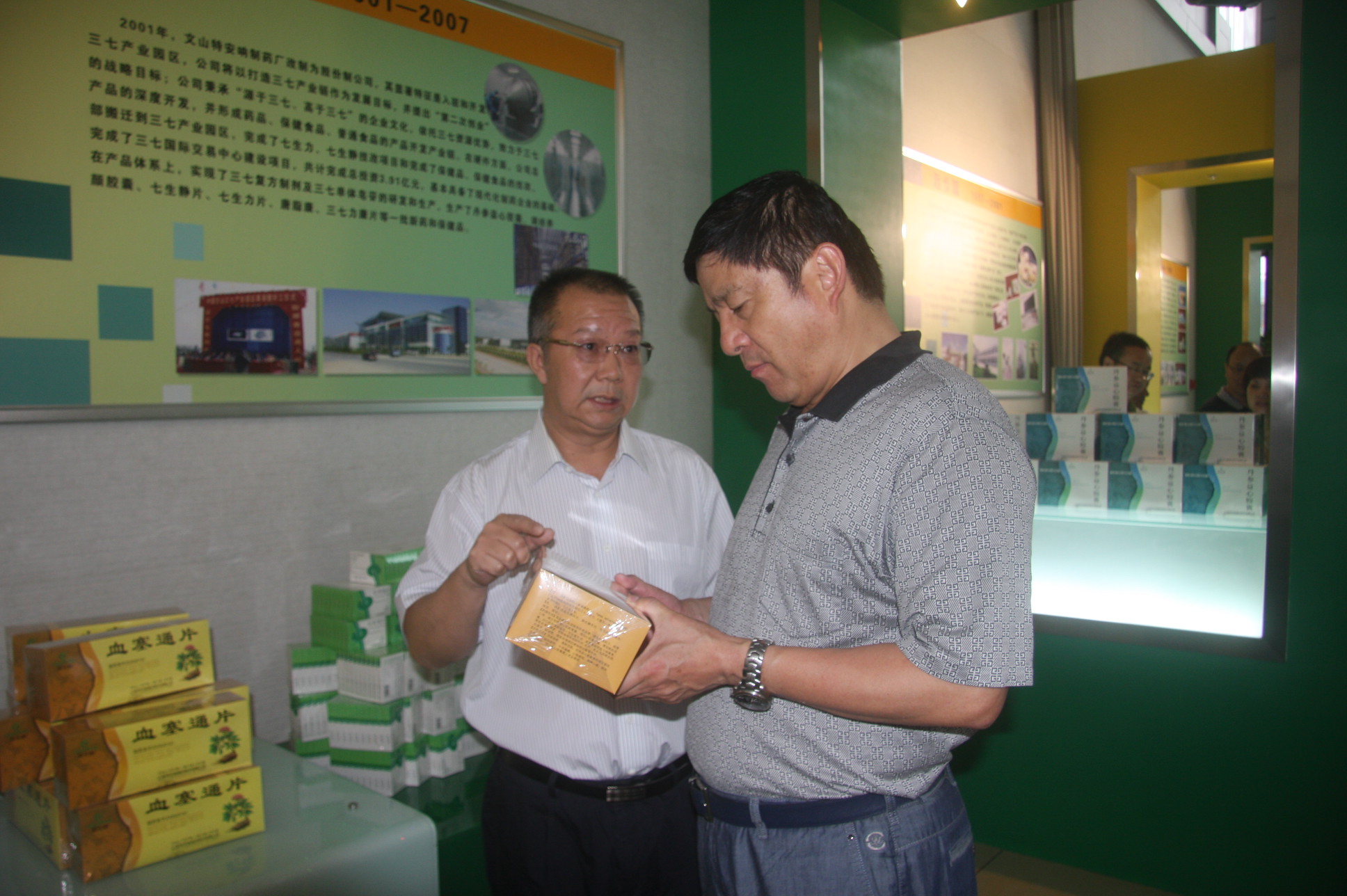 2014年9月14日,省工信委主任岳躍生在文山州州長黃文武和文山市市委書記李云龍等領(lǐng)導的陪同下,蒞臨特安吶公司參觀。公司董事長唐修文、副董事長陳奕先、常務副總經(jīng)理田慶、副總經(jīng)理李明昆、董事會秘書熊文福在展示廳熱情接待。唐董事長向岳主任一行介紹了公司的發(fā)展歷程和產(chǎn)品情況。血塞通片為公司的主導產(chǎn)品,對心腦血管疾病有確切療效,年銷售過億元,占據(jù)片劑市場百分之六十的份額;七生力片、七生靜片是公司的獨家產(chǎn)品,代表三七研發(fā)高端水平,擁有自主知識產(chǎn)權(quán);丹參益心膠囊、調(diào)經(jīng)養(yǎng)顏膠囊兩個產(chǎn)品對冠心病、婦科病有確切療效,也是獨家產(chǎn)品。唐董事長還向岳主任介紹了公司發(fā)展思路和產(chǎn)品規(guī)劃。岳主任鼓勵公司加大研發(fā)投入,開發(fā)出適應市場需求的產(chǎn)品,把三七產(chǎn)業(yè)進一步做強做大。